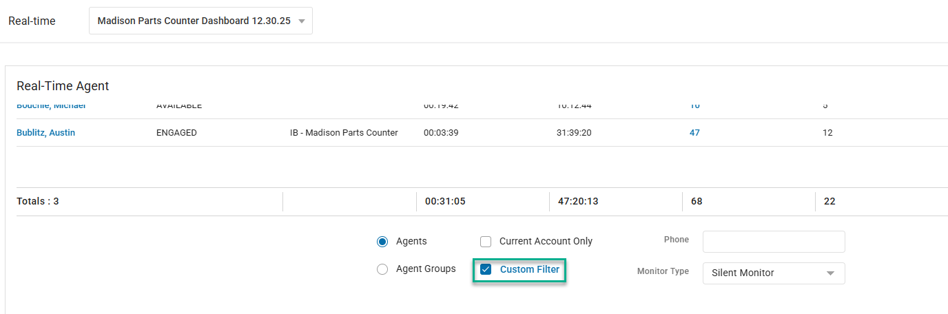 - When a new user is added, the only widget that needs to be updated is the top one (Real-Time Agent). All other widgets show statistics for the entire queue, and not individual users. Scroll down to the bottom of the Real-Time Agent widget and click on Custom Filter.
