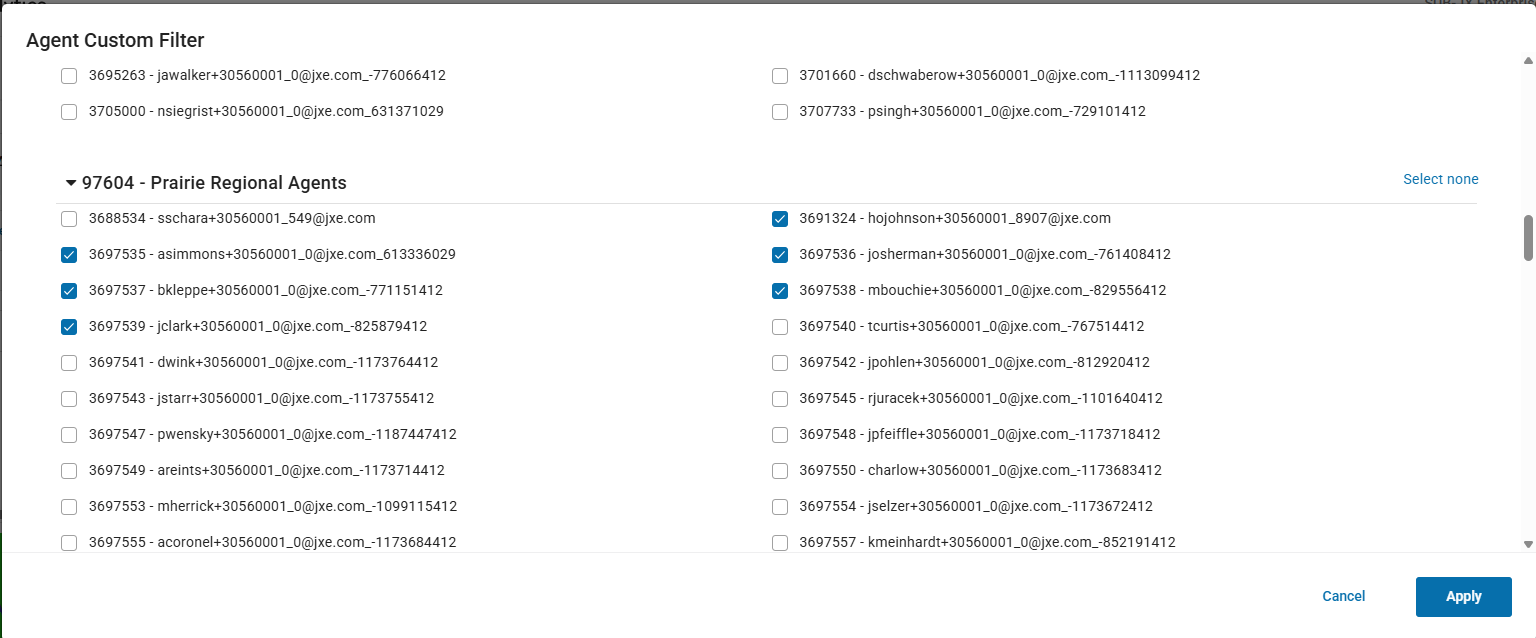 - Scroll down to the correct region, and check the box next to the username of any agents you're adding, then Apply.