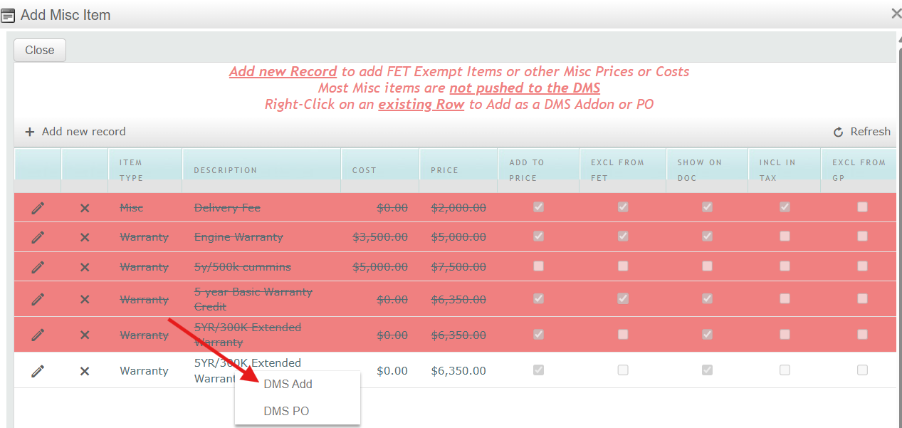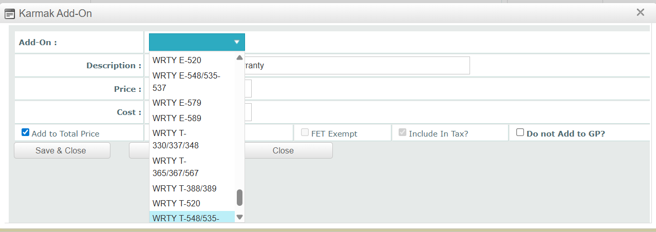 Choose the add-on from the drop-down menu that matches the type of the miscellaneous item